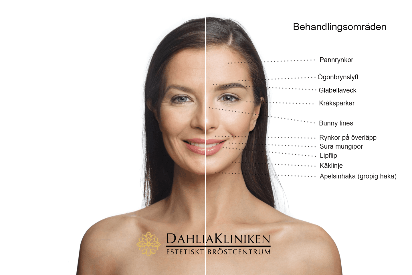 De vanligaste områdena som man brukar behandla estetiskt är glabella, pannan och kråksparkarna.